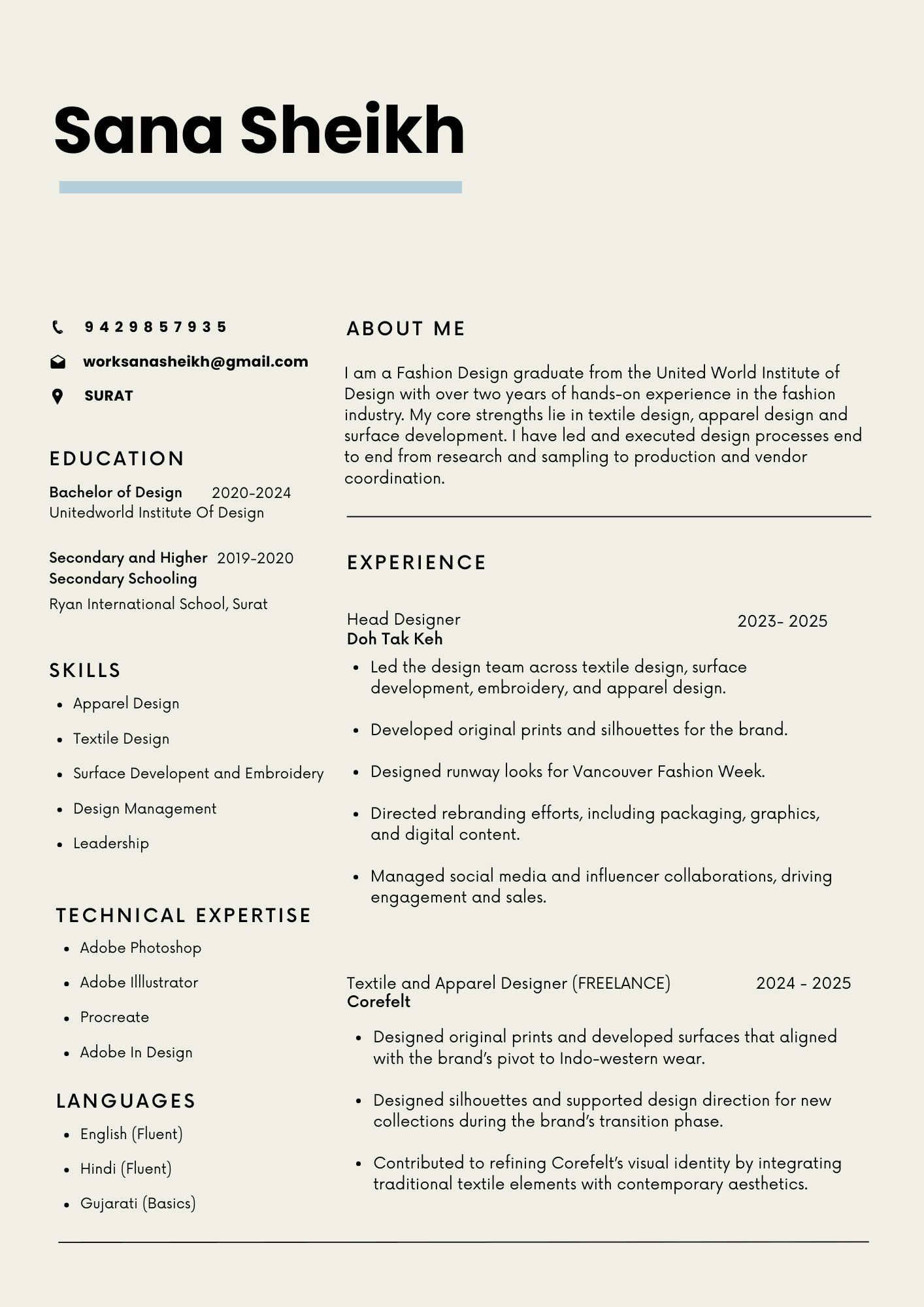 Hey, It's Sana This side. I am a multidisciplinary designer with a Bachelor’s in Fashion Design from the Unitedworld Institute of Design, Gandhinagar. My work sits at the intersection of culture, craft, and contemporary expression.