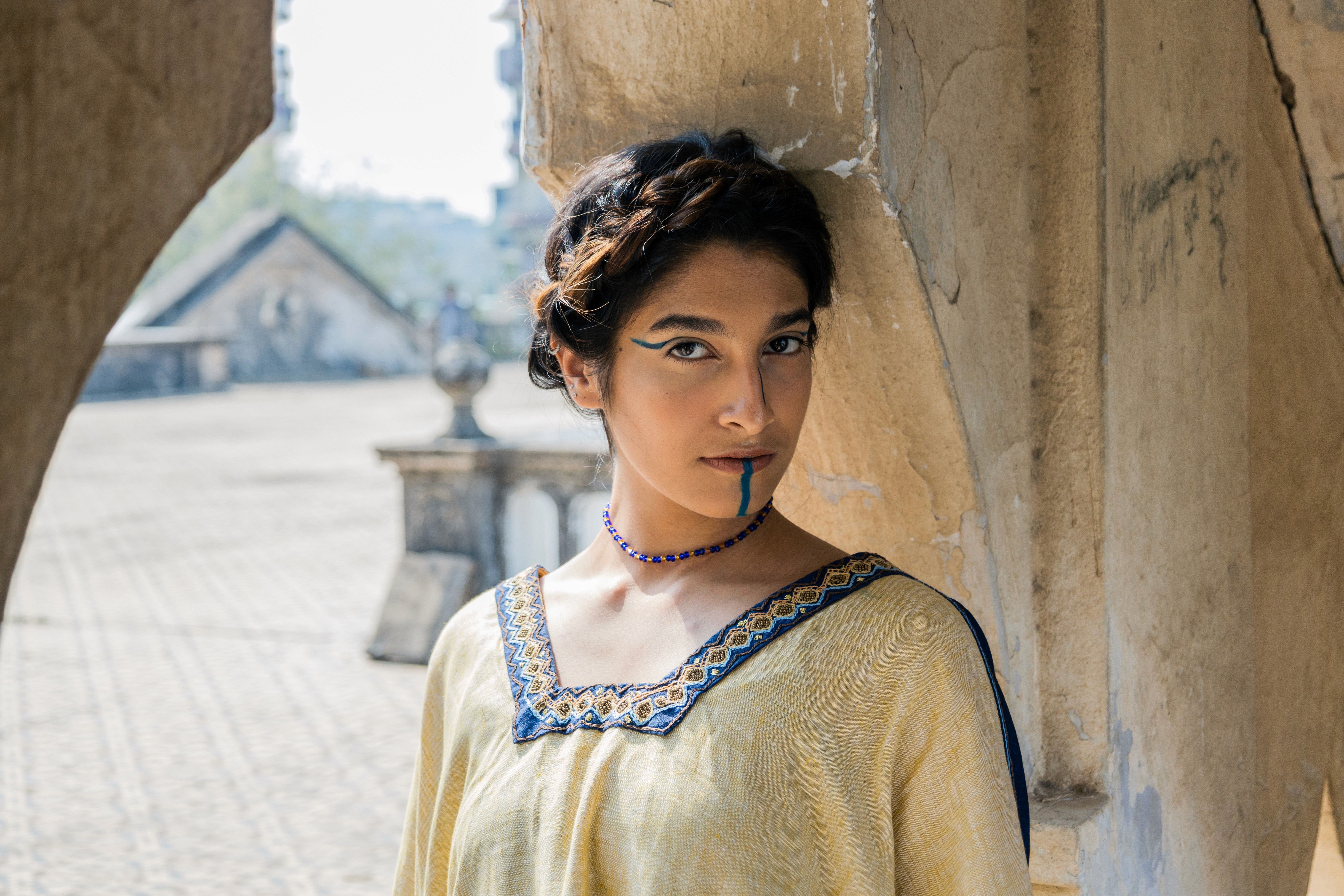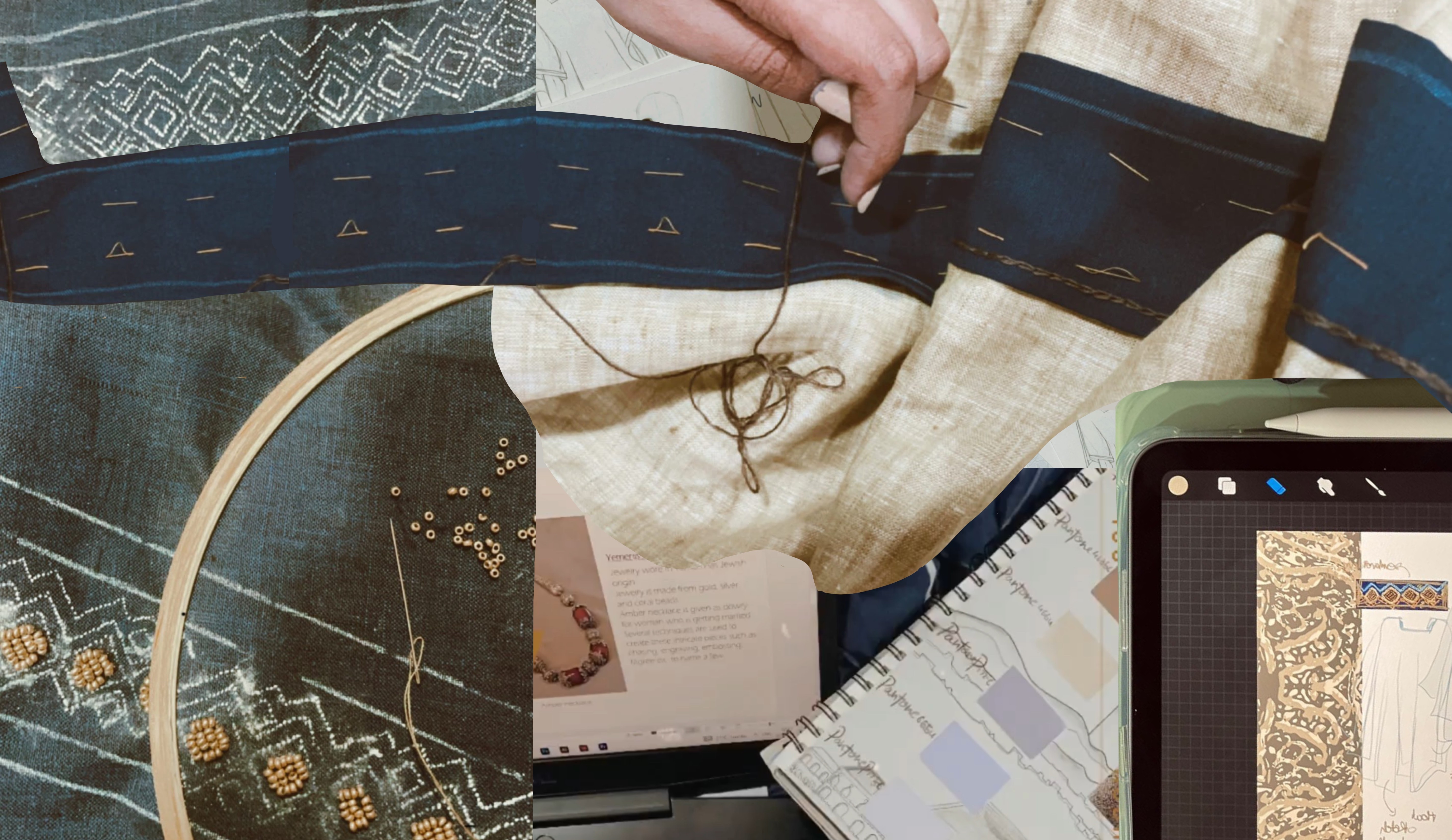 Glimpses of hand-stitching and hand-embroidering the garment.