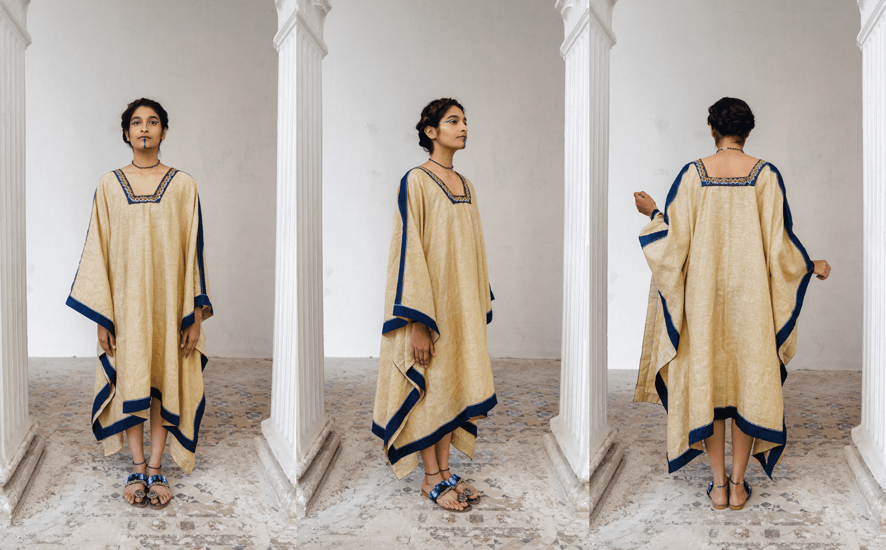 Glimpses of hand-stitching the garment and hand-embroidering details at the neckline.